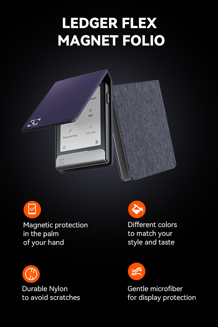 Protect your Ledger Flex™ with Ledger Flex™ Magnet Folio, a magnetic case that helps prevent scratches and keeps your Ledger device sheltered. Available in different colors, to match your style and taste.
