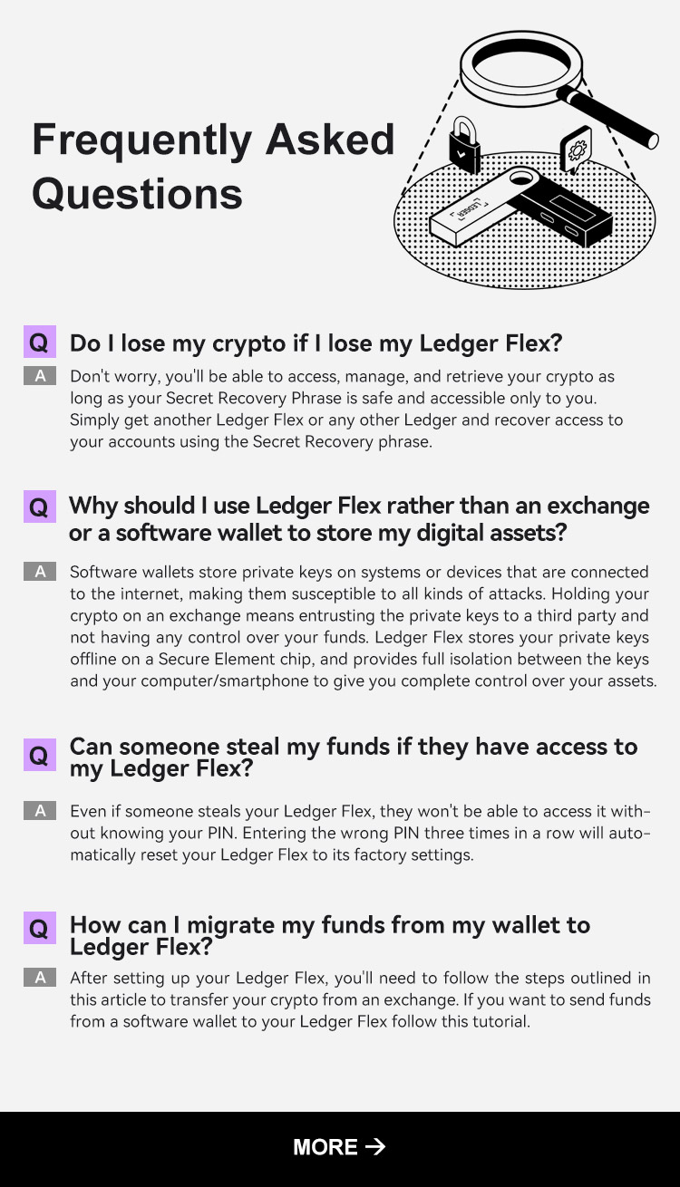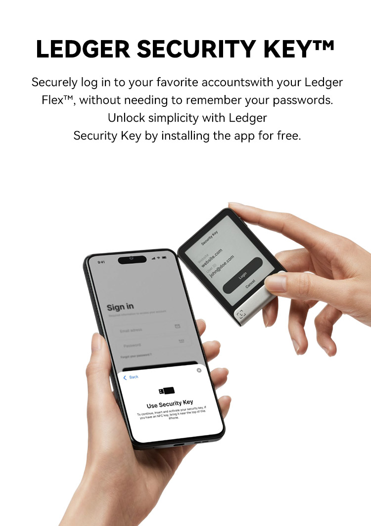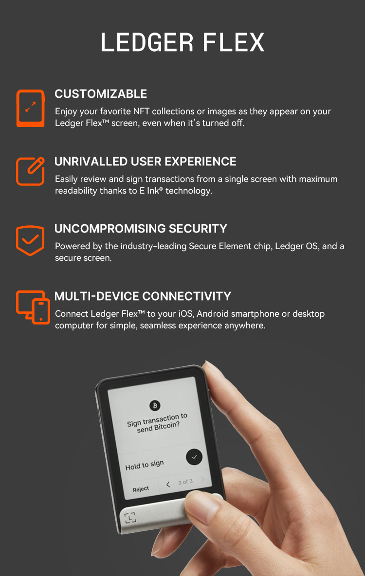了解 Ledger Flex™,这是我们的新一代 Ledger 钱包,配备安全的 E Ink® 触摸屏。它搭载安全元件芯片和 Ledger 专有操作系统,可将您的资产密钥离线保存,远离黑客攻击。在全球首款安全的 E Ink® 触摸屏上,您可以轻松自信地查看交易并进行 Clear Sign 签名。